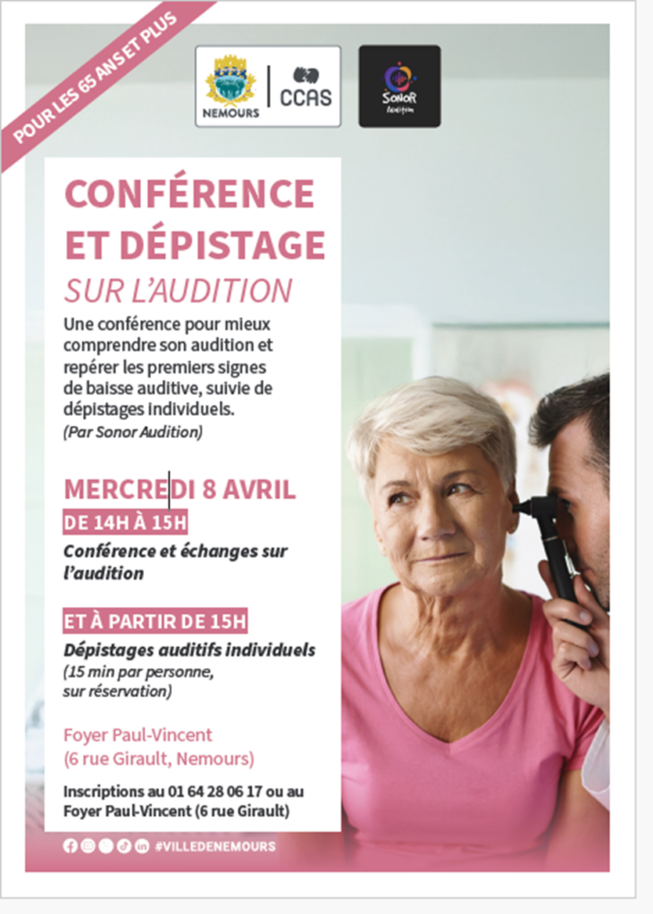 Le CCAS de Nemours propose à ses résidents une conférence sur l'audition le mercredi 8 avril de 14h à 15h.