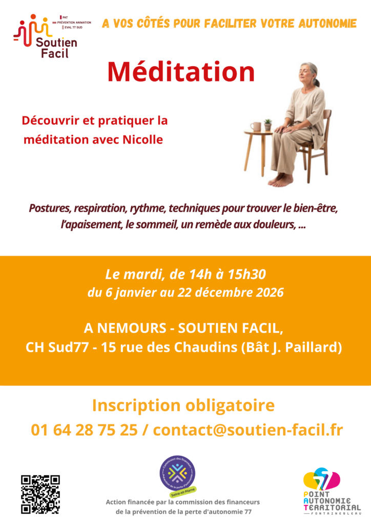 Des moments conviviaux à la découverte de la méditation et ses bienfaits, tous les mardis de 14h à 15h30 dans nos bureaux de Nemours.